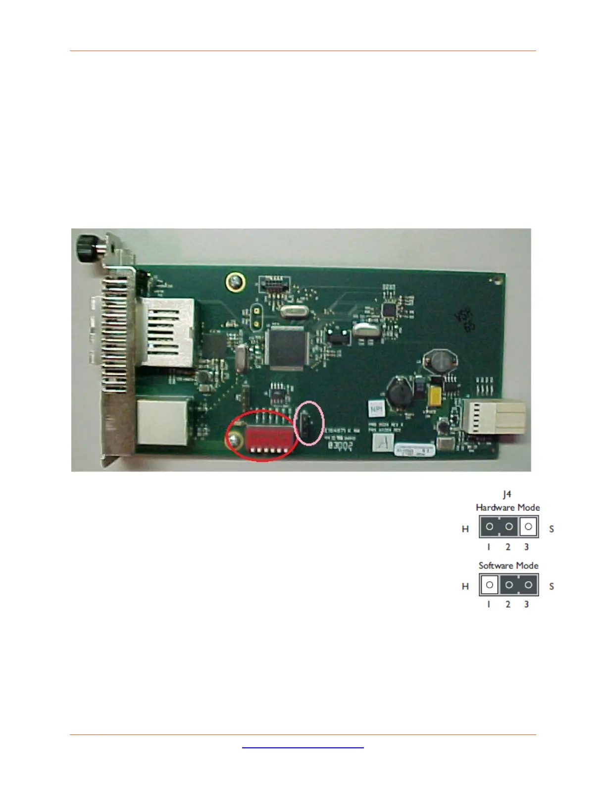 The C3110 PCB layout is shown below. Two-position Jumper J4 is circled in pink. Six-position DIP Switch