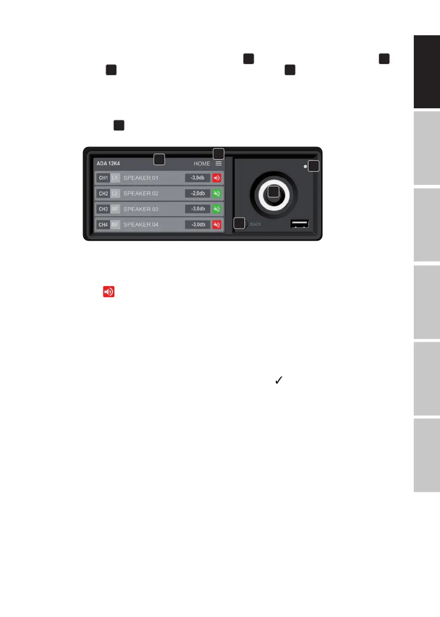 of the two pages, click on any given output and adjust the level or delay by turning the rotary encoder.
