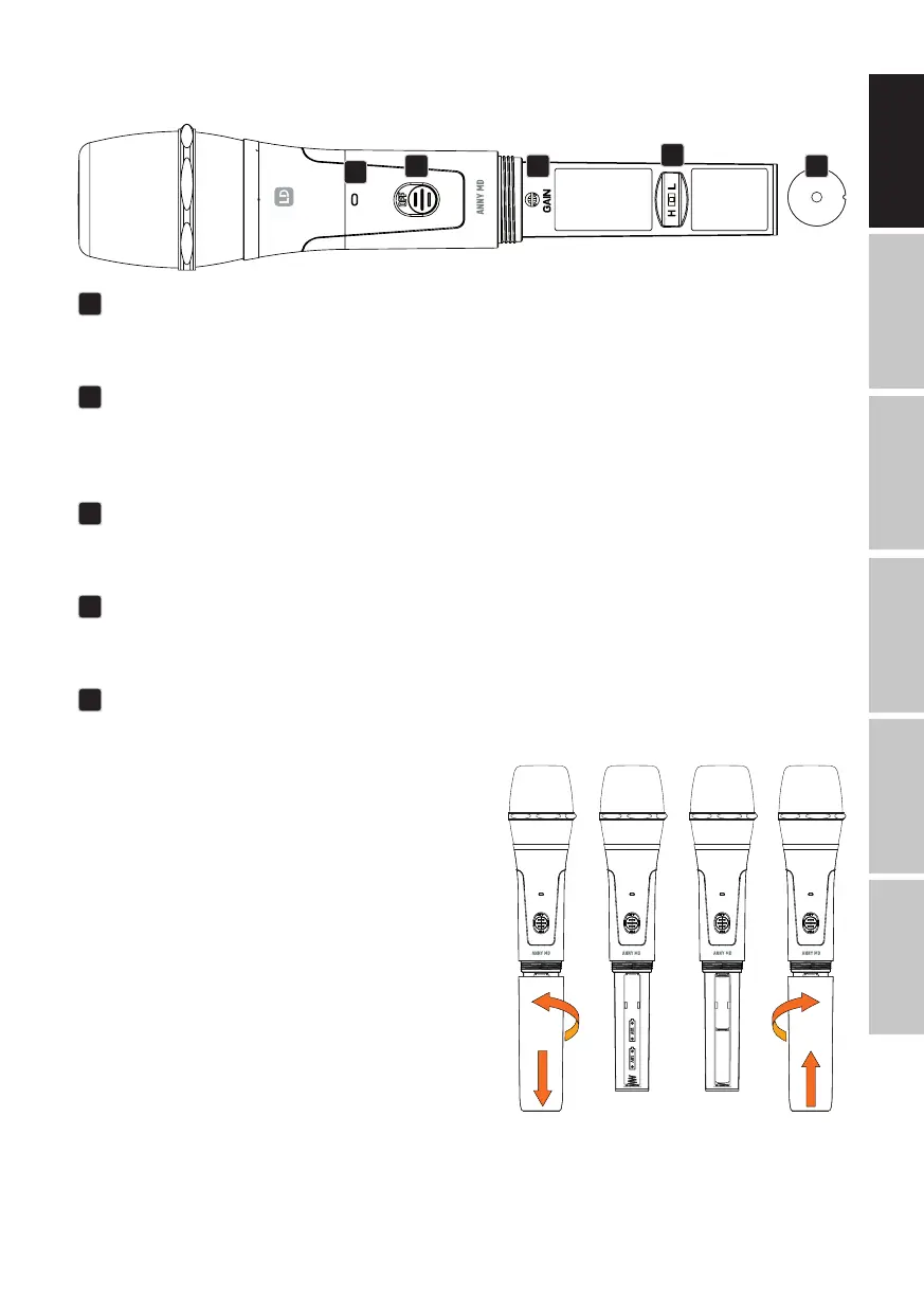 On or off switch. Slide the switch upwards to switch the handheld transmitter on; the word „ON“ can
