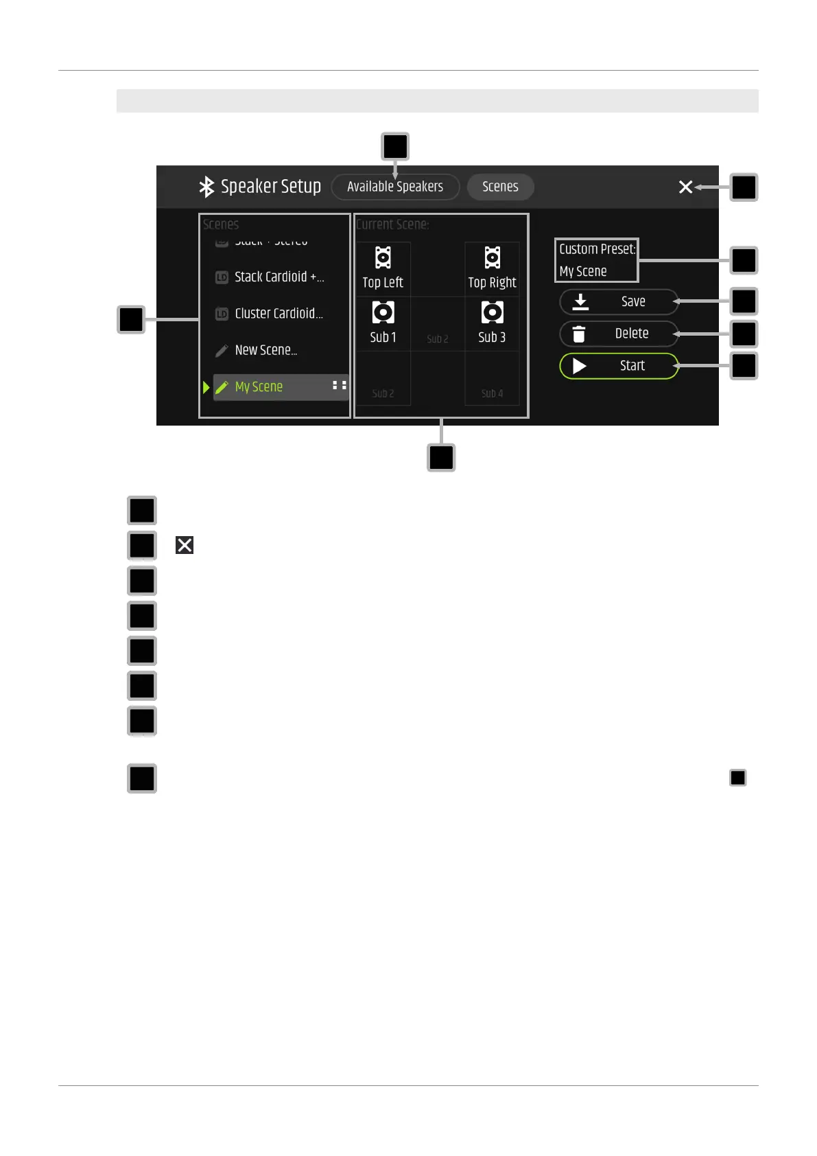 Start - Activates the scene and deploys settings to connected loudspeakers