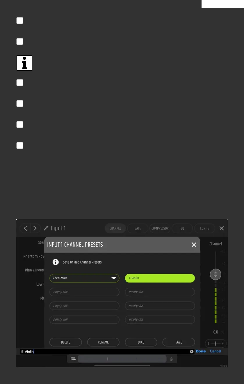 Tap PRESETS to either select a ready-made channel preset or to save the settings in seven individual presets.