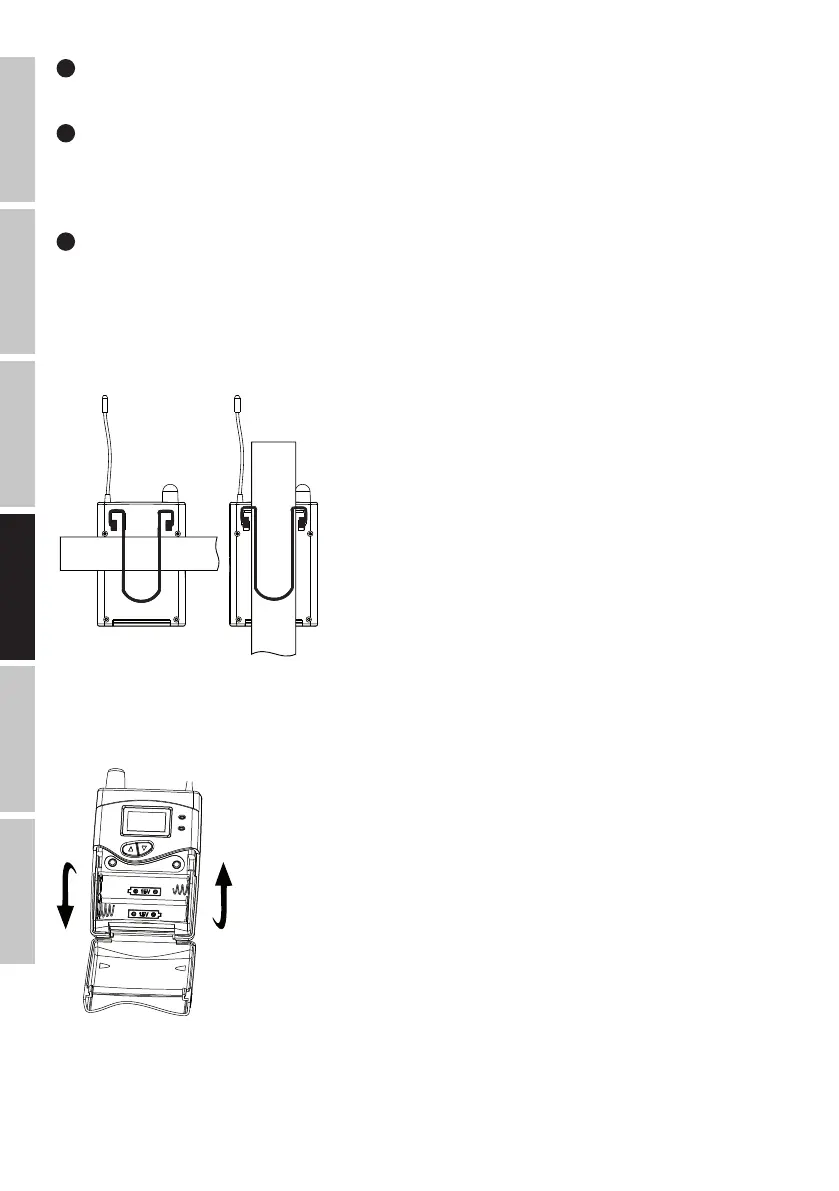 El receptor se cuelga de un cinturón mediante el clip. Se recomienda deslizar el clip de la petaca hasta el fondo (ver figura).