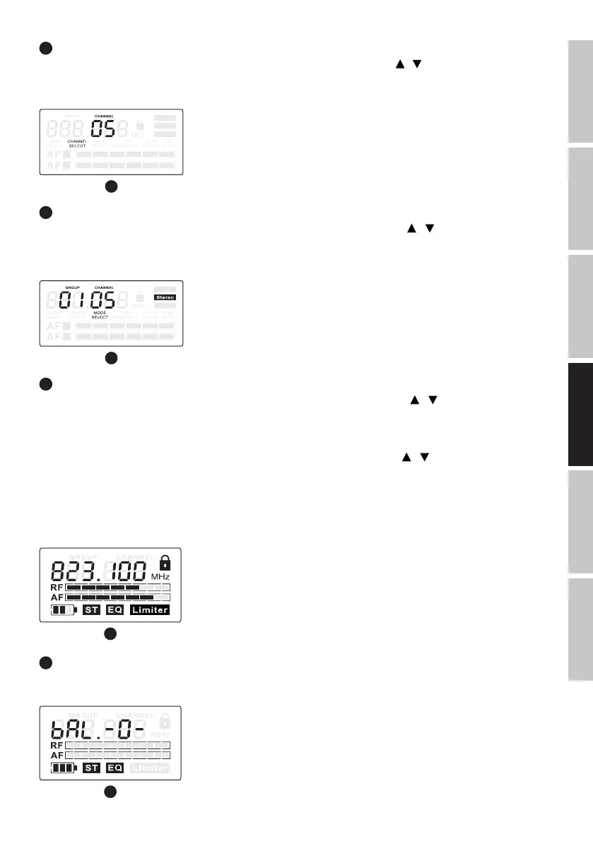 En el menú principal se muestran la frecuencia de RF, los niveles de AF y RF, el modo de funcionamiento (mono/estéreo), el EQ, el limitador