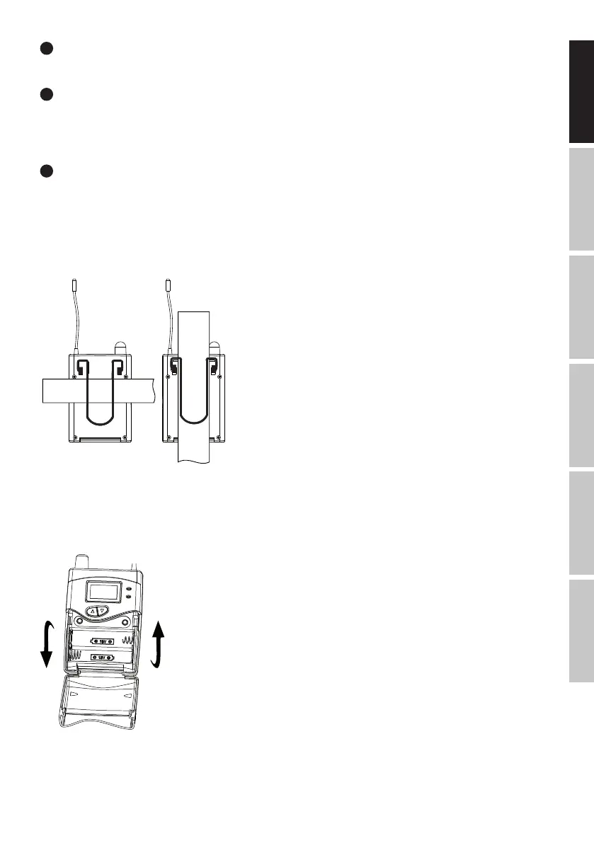 Clip the receiver to your belt or a suitable strap. For optimum fit, the clip should always be pushed all the way over the belt and/or strap