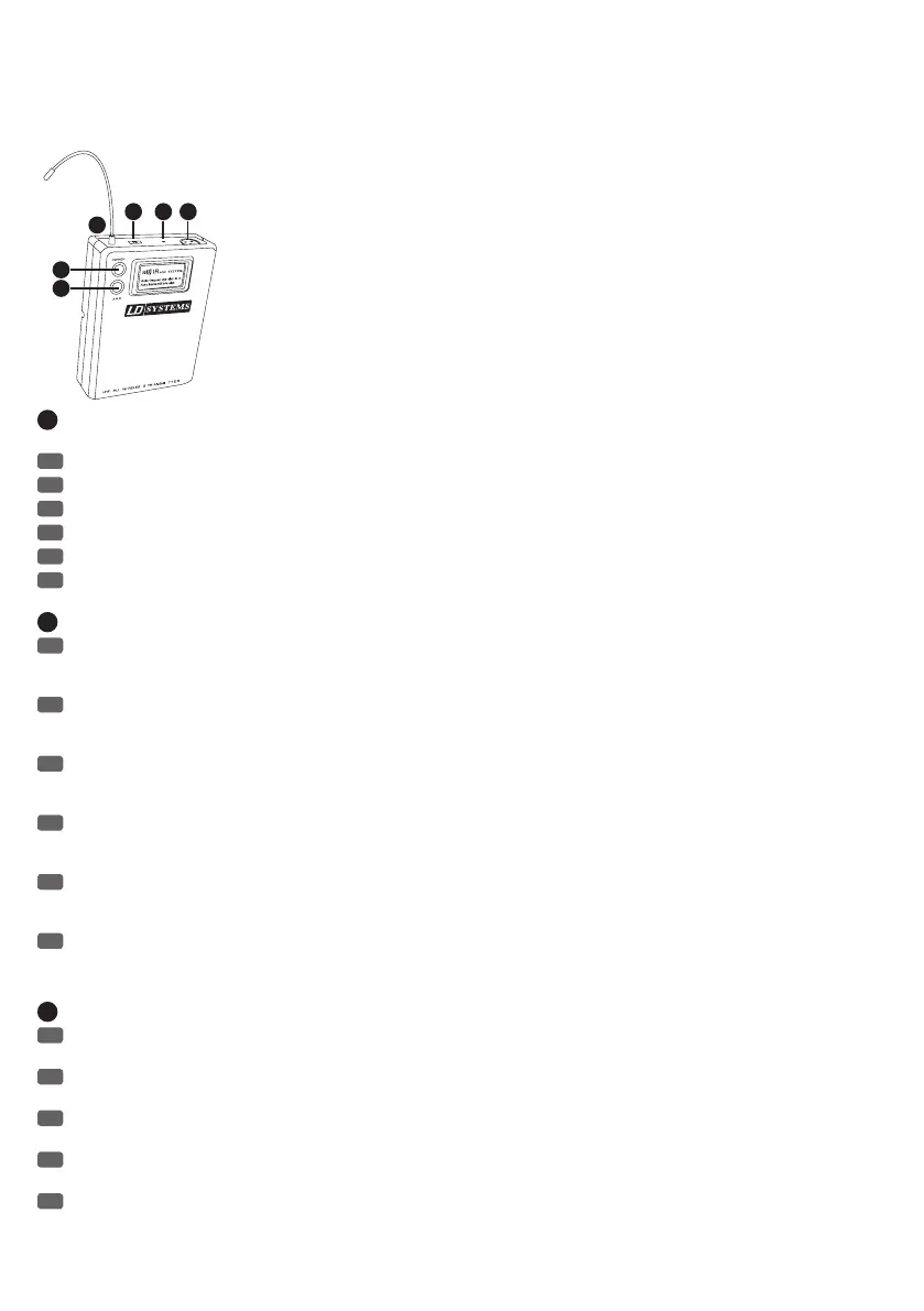 LED lights up green: Belt pack transmitter is turned on and battery status is ok. LED flashes green: Channel synchronization via infrared active.