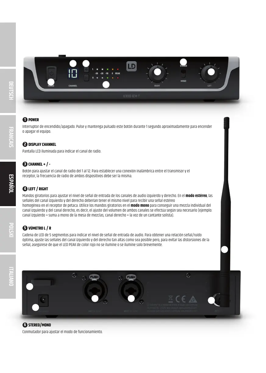 MONO: Las señales de audio presentes pasarán internamente a mono y se transmitirán de ese modo al receptor de petaca.