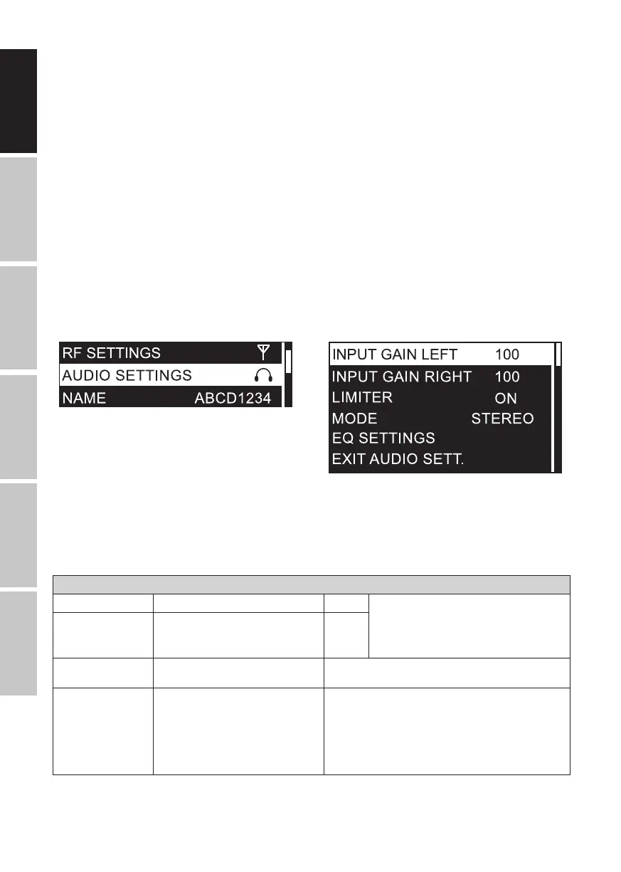 AUDIO SETTINGS (change value = turn encoder, conrm value change = press encoder)