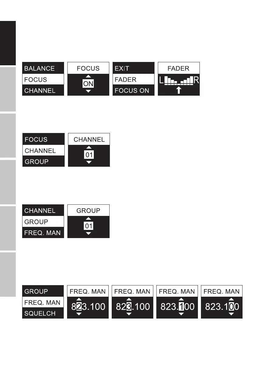 arrow button to conrm. Press again to activate the FOCUS ON mode. Conrm by pressing SEL and now select FADER by pressing SEL repeat-