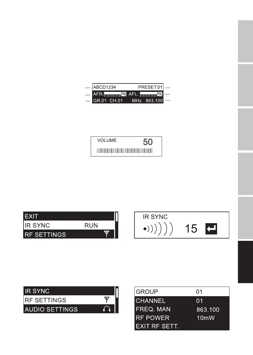 del trasmettitore (MENU) per accedere al menu principale e, ruotando l'encoder, selezionare la voce di menu IR SYNC RUN (sfondo chiaro). Premere