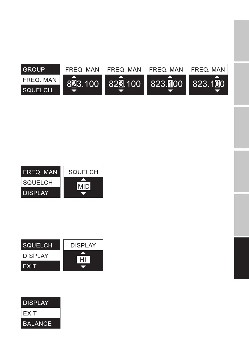 FREQ. MAN. (su sfondo chiaro) e confermare premendo il tasto . Selezionare un'area di radiofrequenza inferiore a 820, 830 o 860 MHz premendo