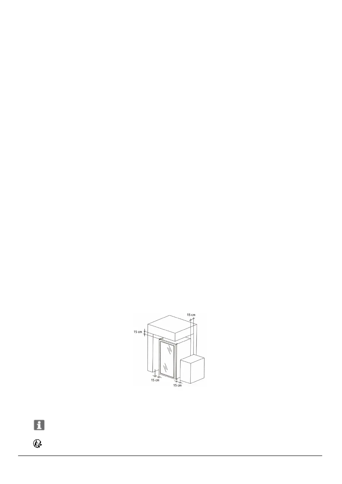To ensure adequate ventilation of the fridge, allow a minimum of 15 cm between the wine fridge and the