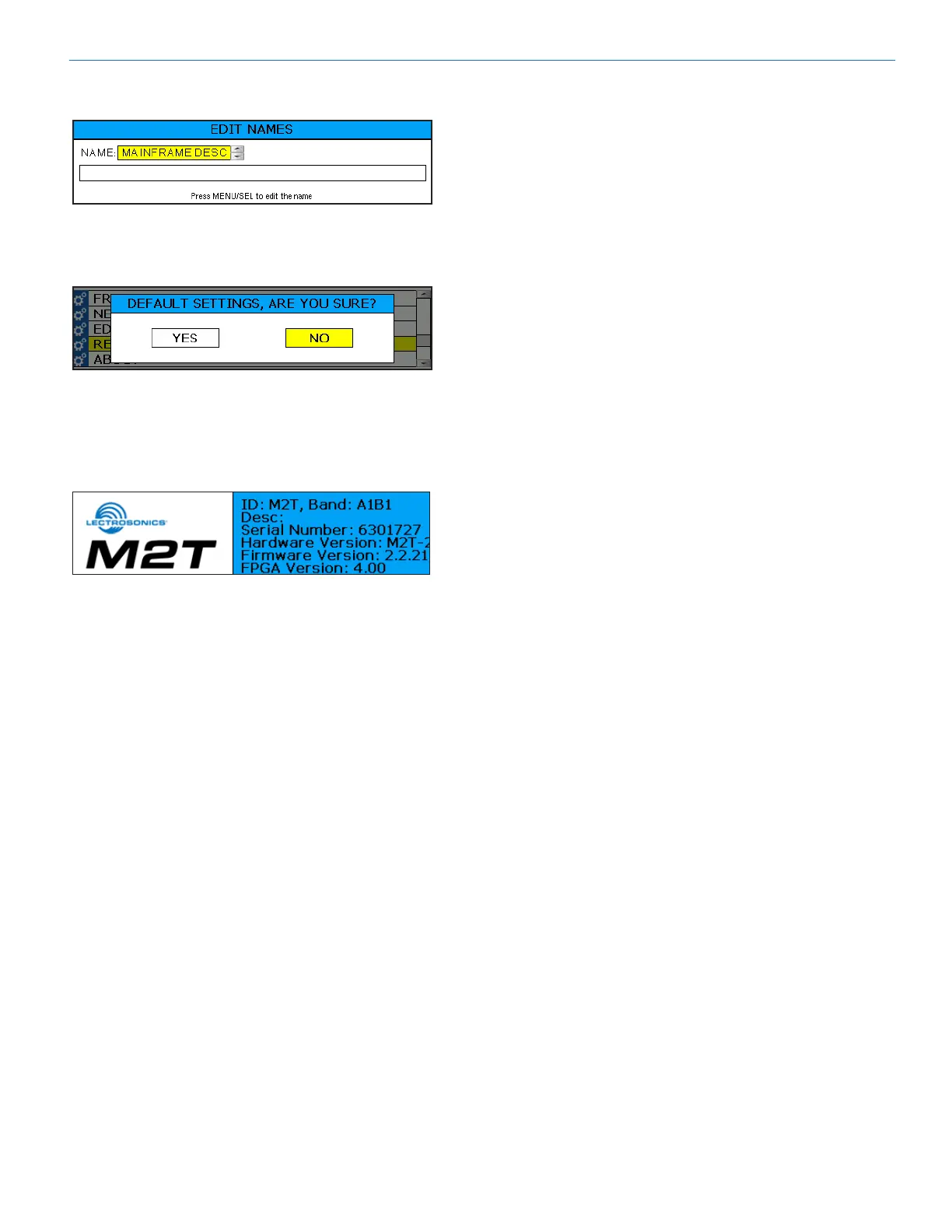 Displays general information about the M2T, M2T/E01,