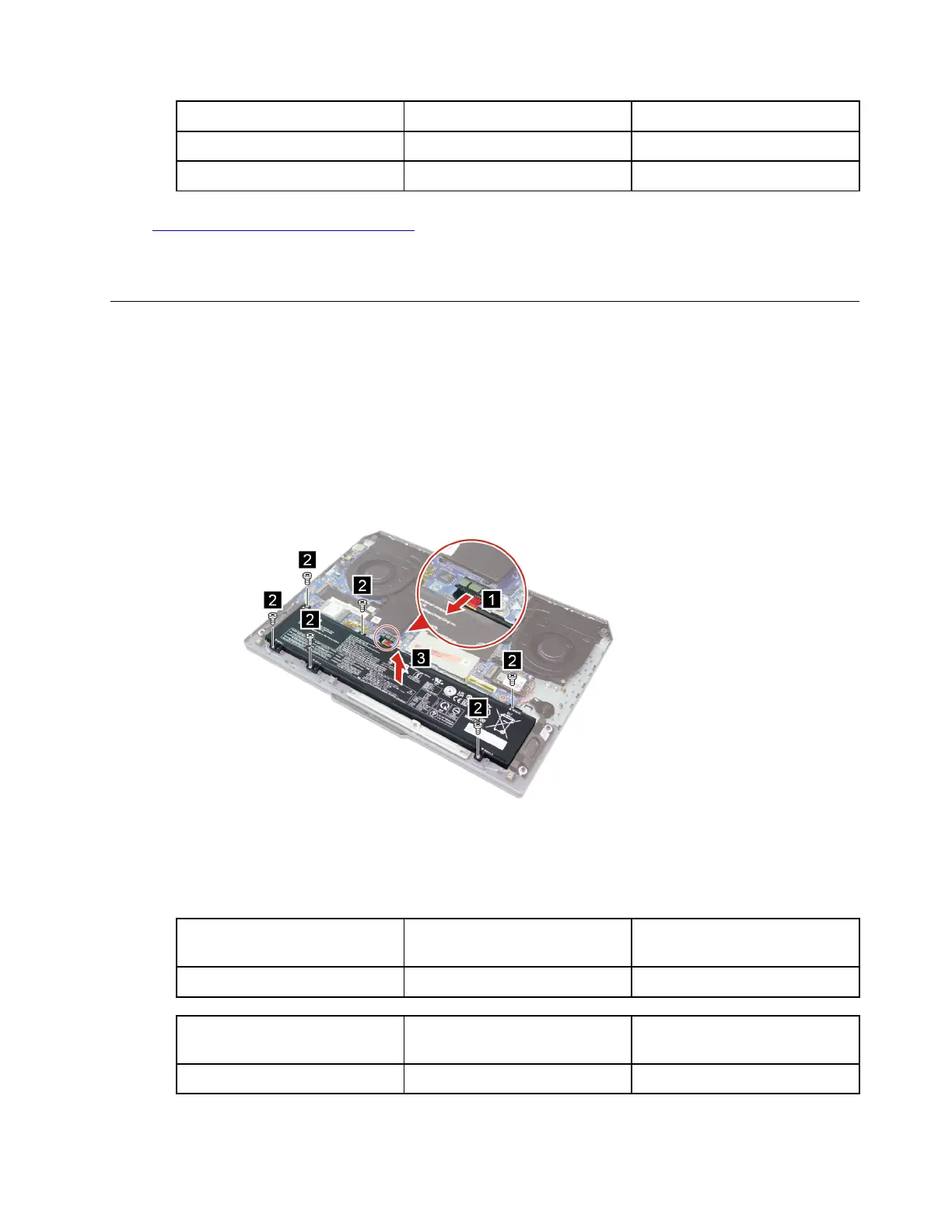 Step 1. Disconnect the battery pack cable from the system board, remove six screws, and remove the