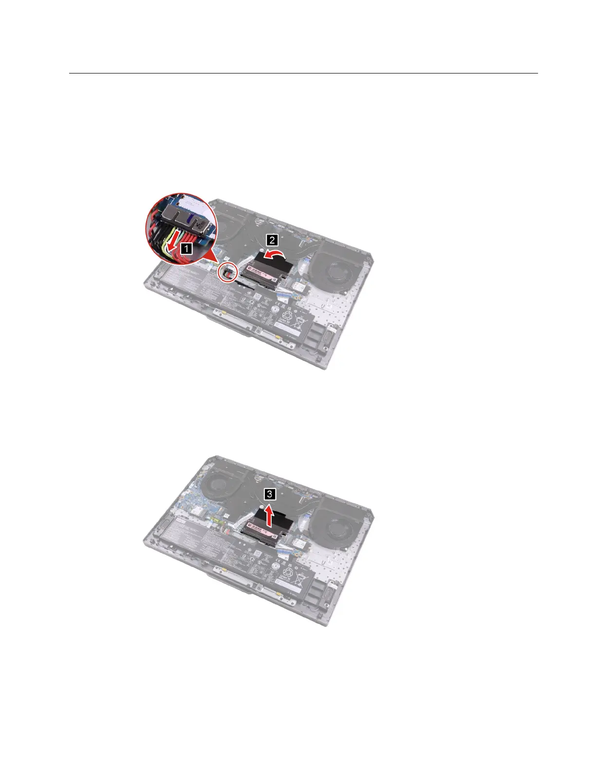 Step 1. Disconnect the battery pack cable from the system board (1) and peel back the mylar (2).