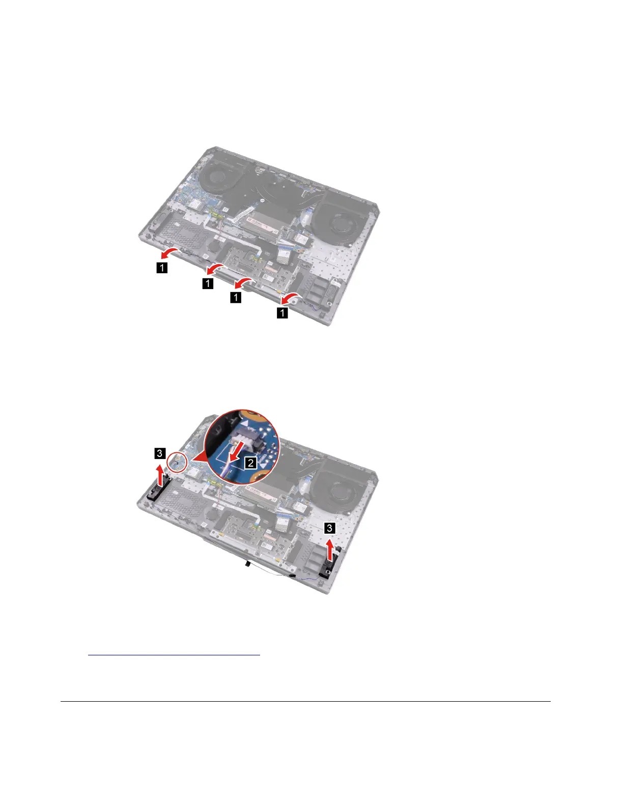 Step 2. Disconnect the speakers cable from the system board (2) and remove the speakers (3).