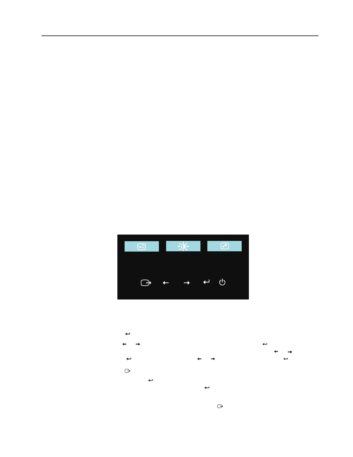 The settings adjustable with the user controls are viewed through the OSD, as shown below.