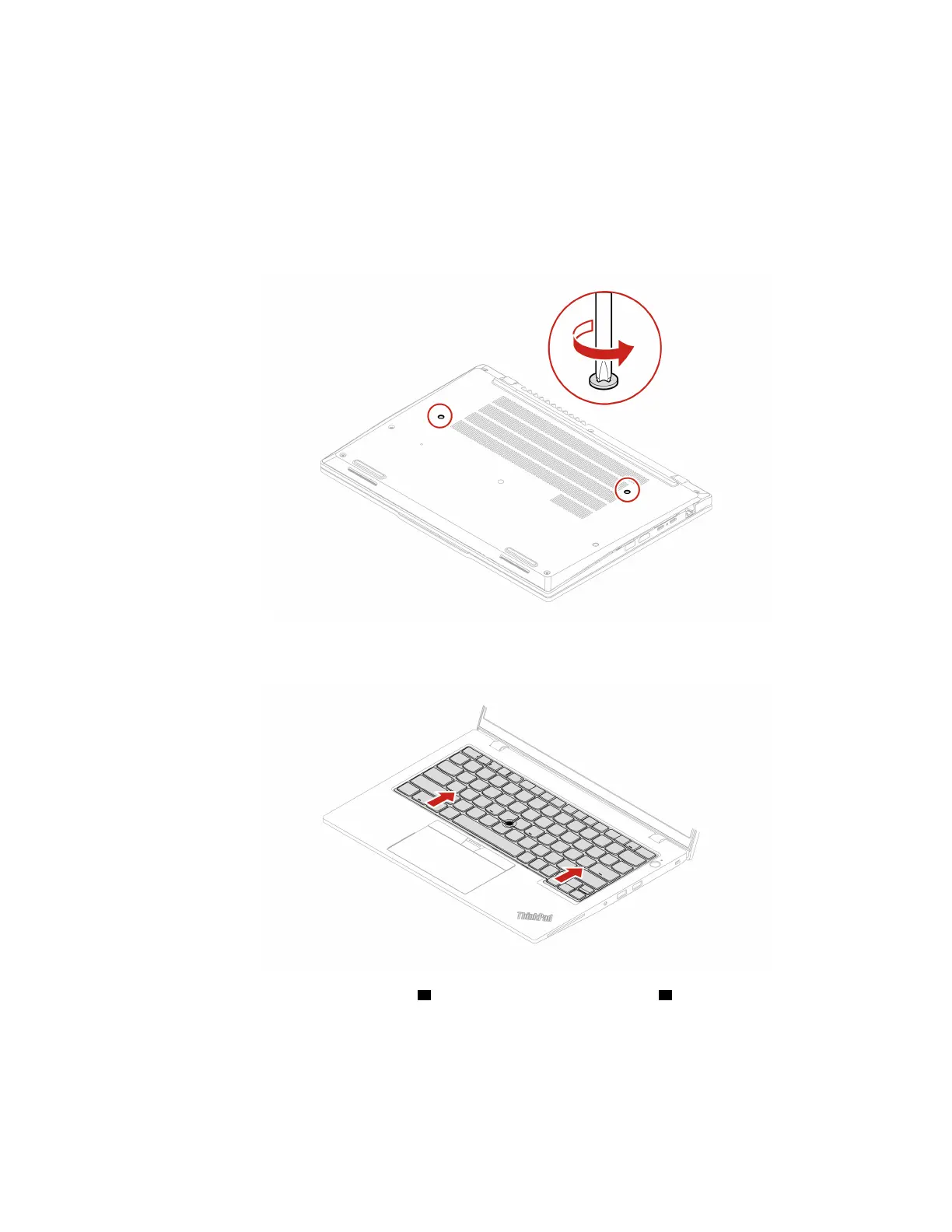 Step 2. Turn over the computer and open the display. Push the keyboard in the direction as shown by