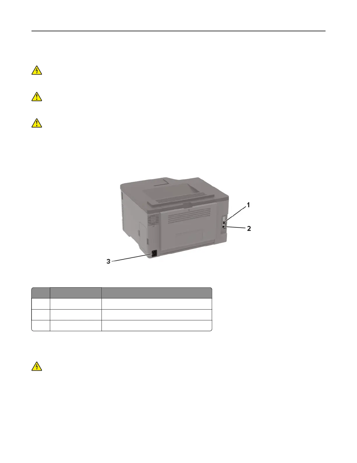 3 Power cord socket Connect the printer to an electrical outlet.