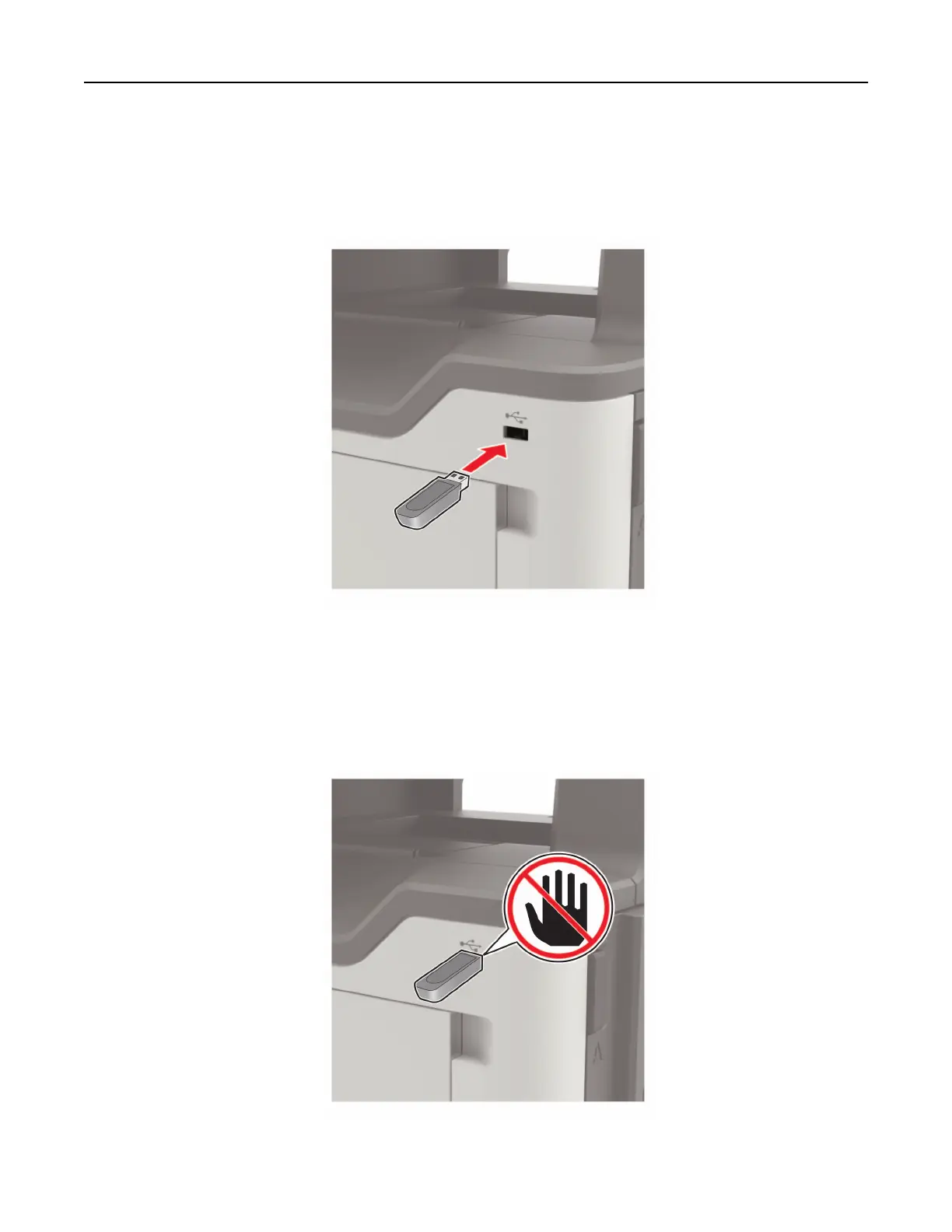 Warning—Potential Damage: To avoid loss of data or printer malfunction, do not touch the flash drive or