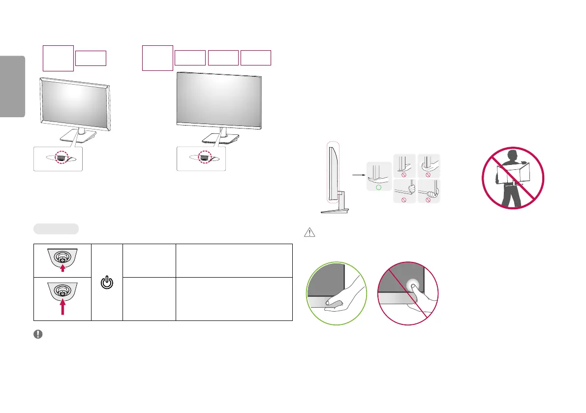 • Hold the bottom and side of the monitor frame firmly. Do not hold the panel itself.