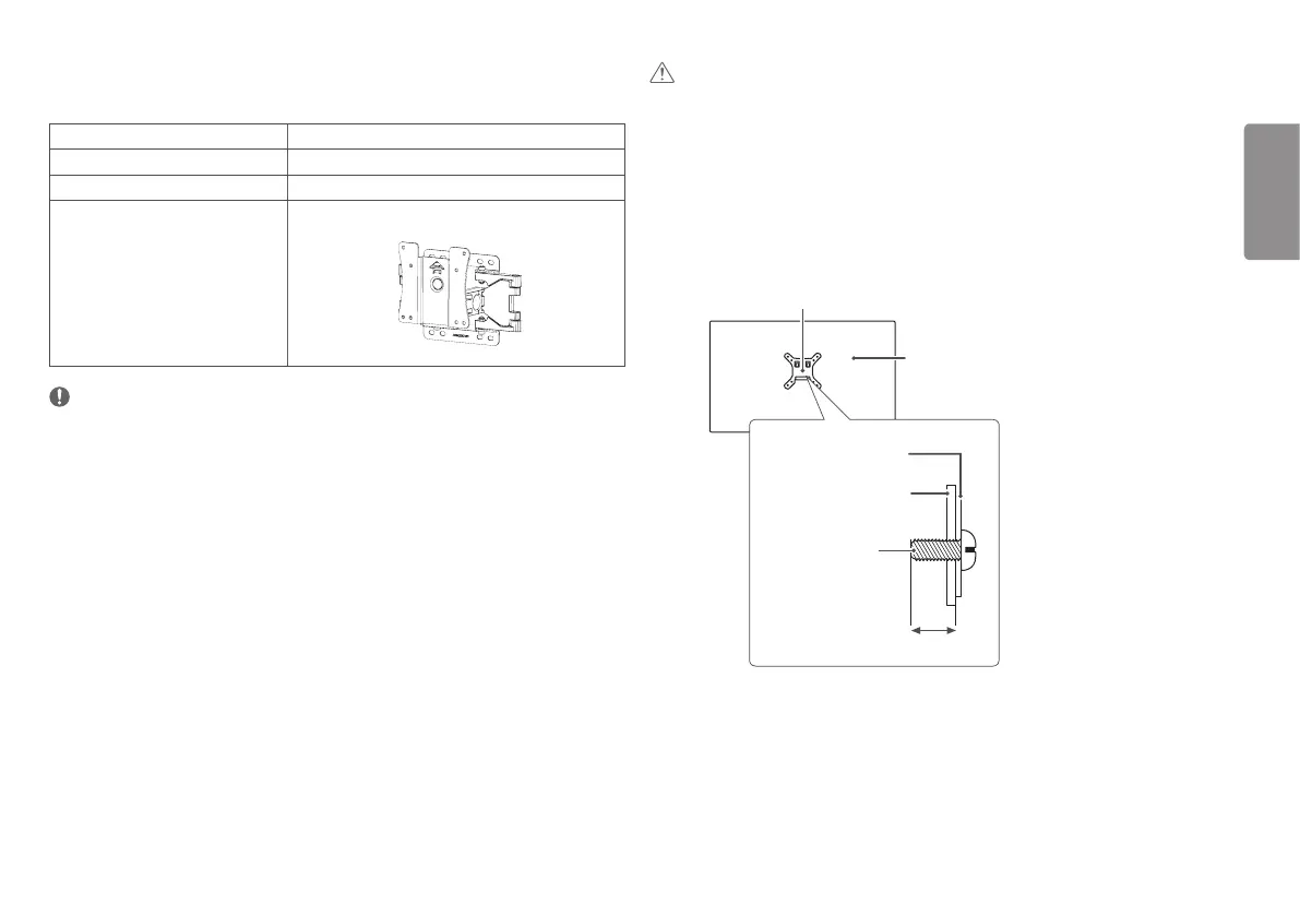 • Use the wall mounting bracket and screws that conform to VESA standards. Damage caused by the use or