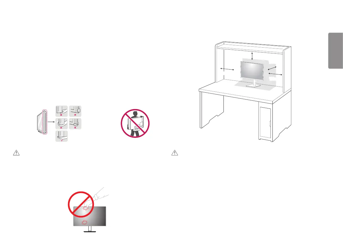 • Houd de onder- en zijkant van de monitor stevig vast. Houd de monitor niet bij het scherm zelf vast.