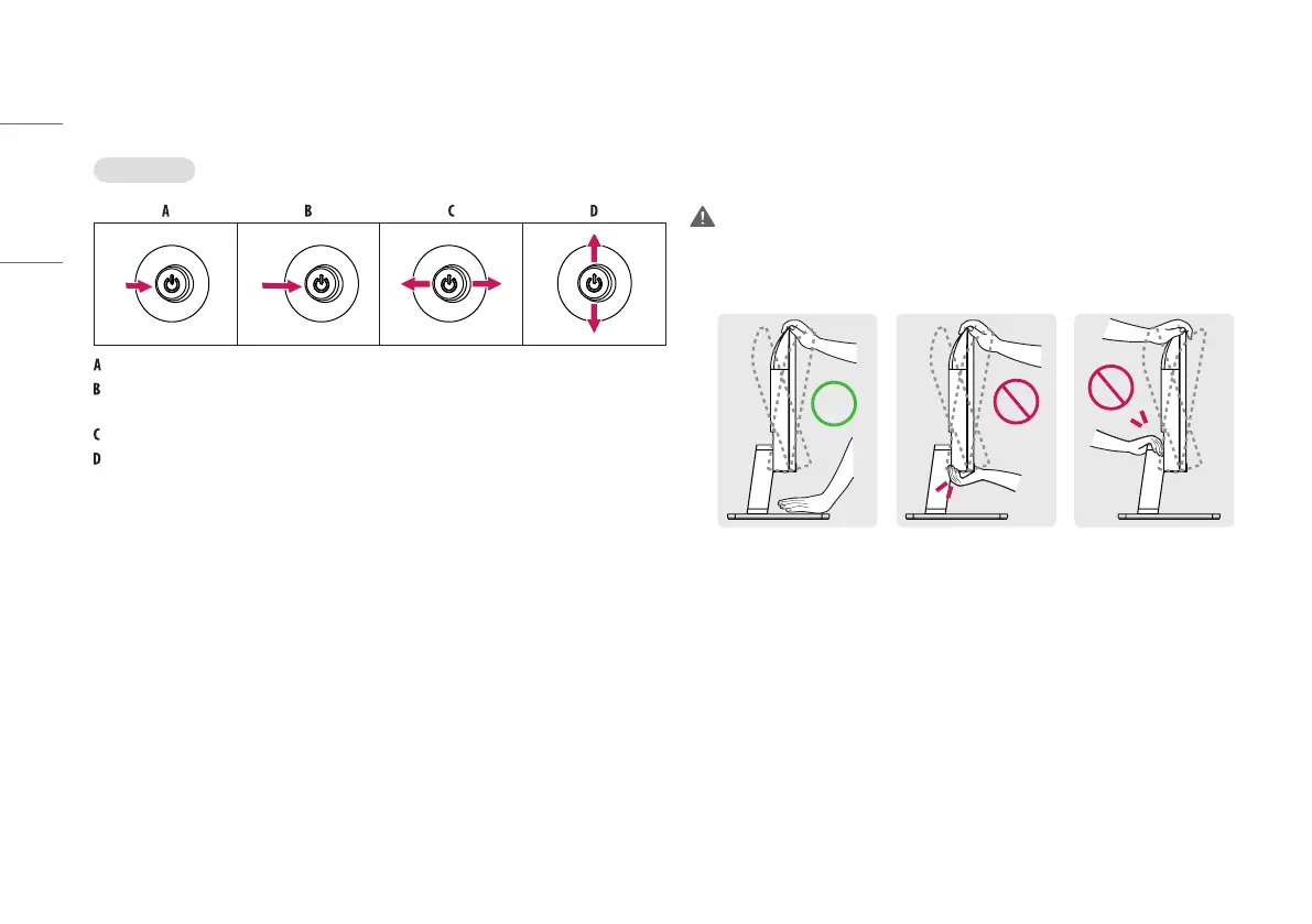• To avoid injury to the fingers when adjusting the screen, do not hold the lower part of the monitor’s frame as