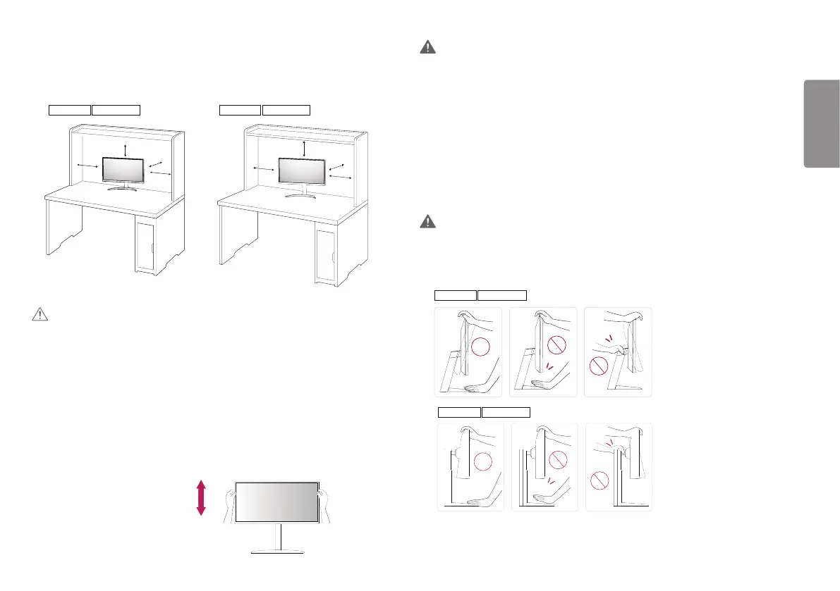 • Plaats uw hand niet op de standaard als u de hoogte van het scherm aanpast, om letsel aan uw vingers te