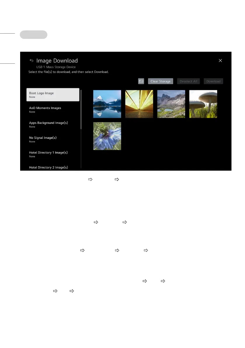 • The image files must be stored in a folder named “LG_DTV” in the root directory of the USB memory device.