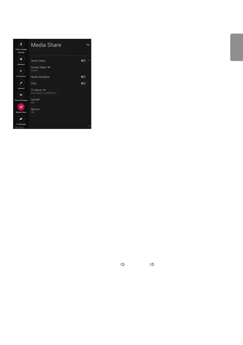 • Smart Share enables DLNA function. If this value is enabled, TV acts as Media Player and displays Media Server contents through Smart Share