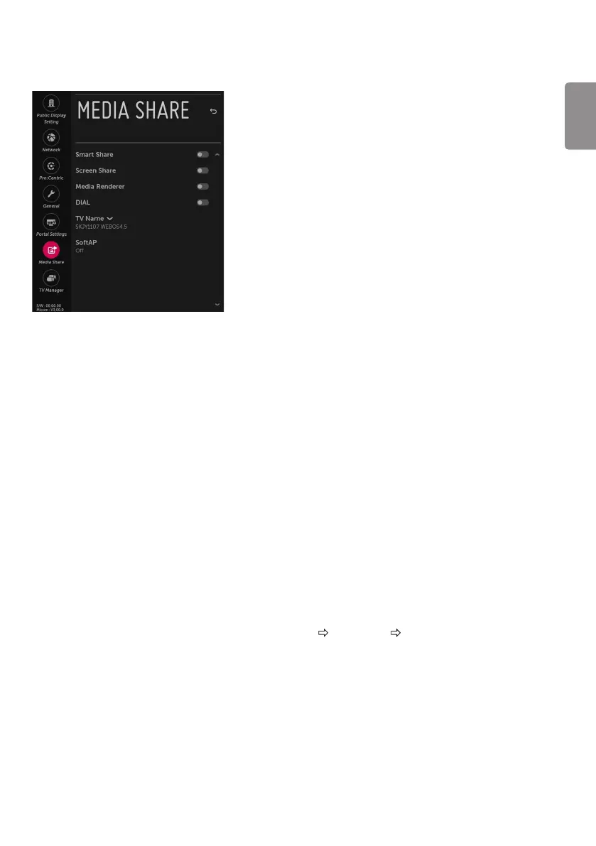 • Smart Share enables DLNA function. If this value is enabled, TV acts as Media Player and displays Media Server contents through Smart Share