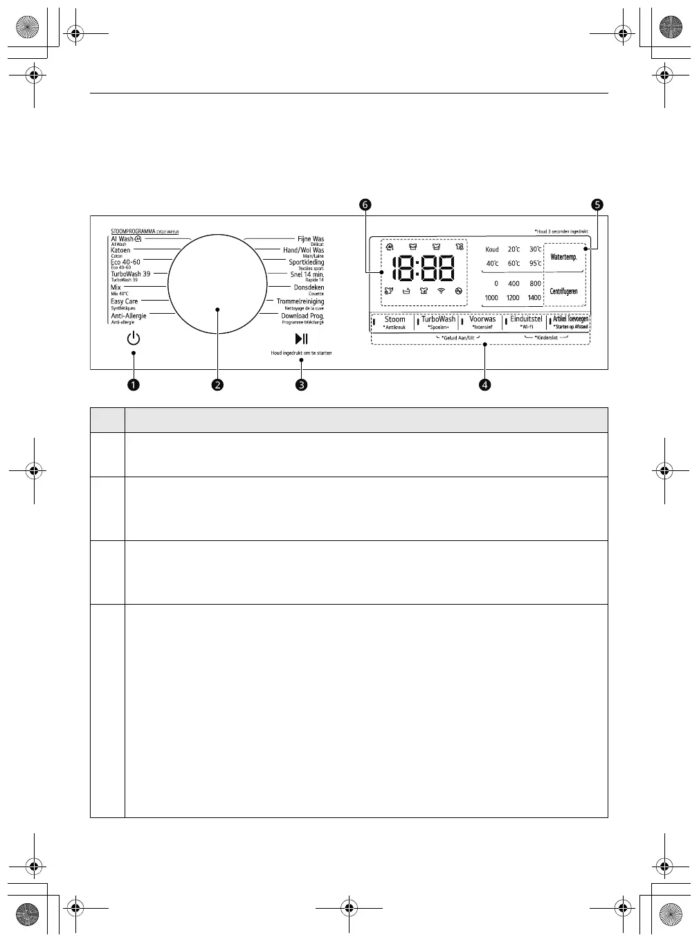 • Druk op deze knop om de wasmachine aan of uit te schakelen.