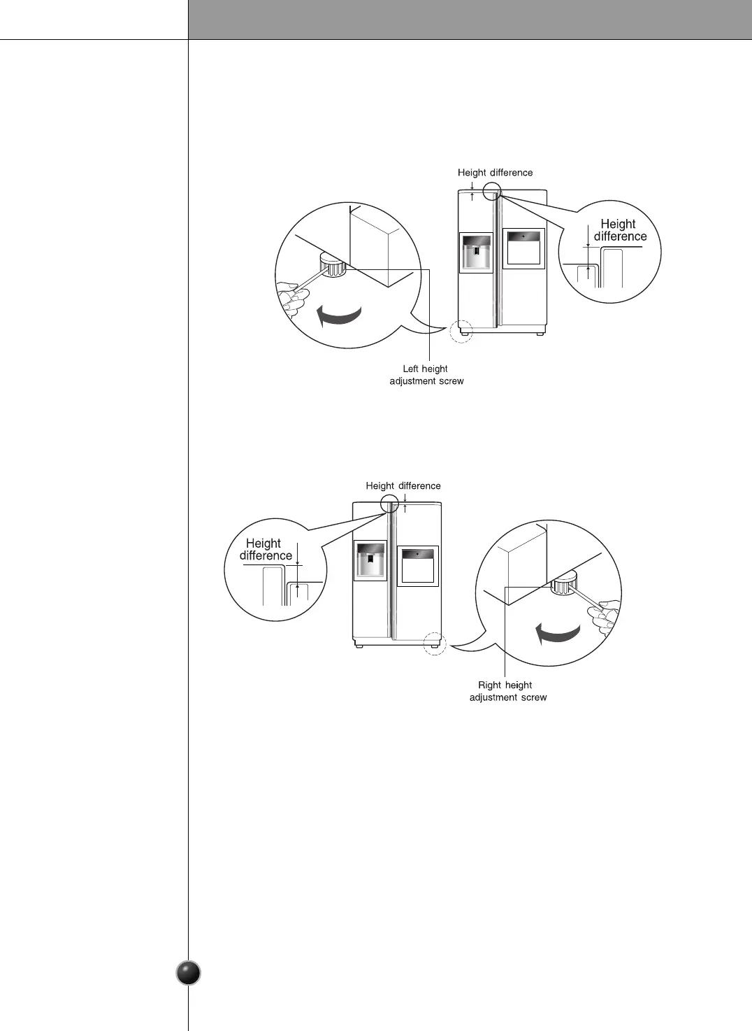 The refrigerator doors will close smoothly by heightening the front side by adjusting