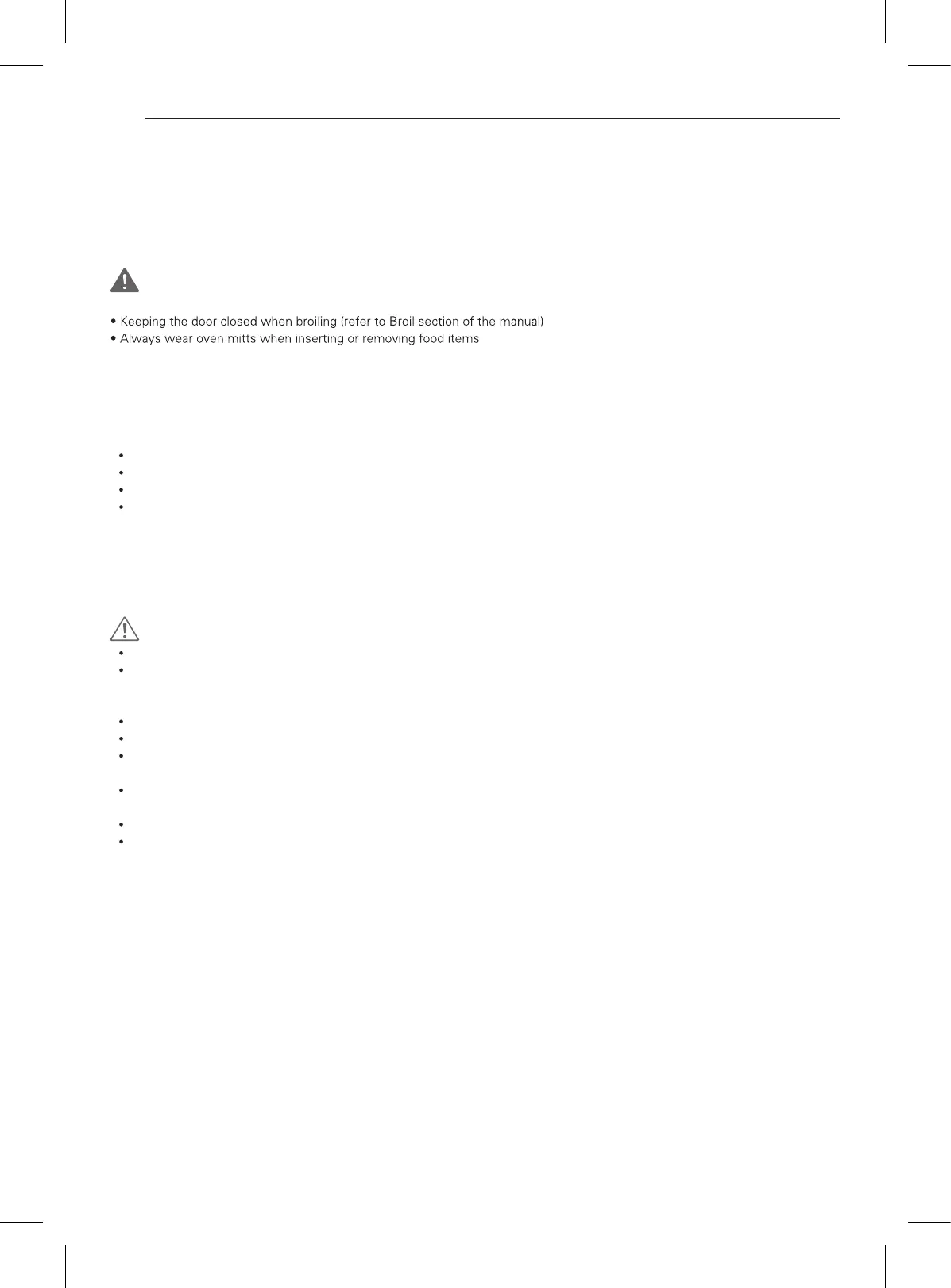 When using your broiler, the temperature inside the oven will be extremely high. Take care to avoid possible burns by: