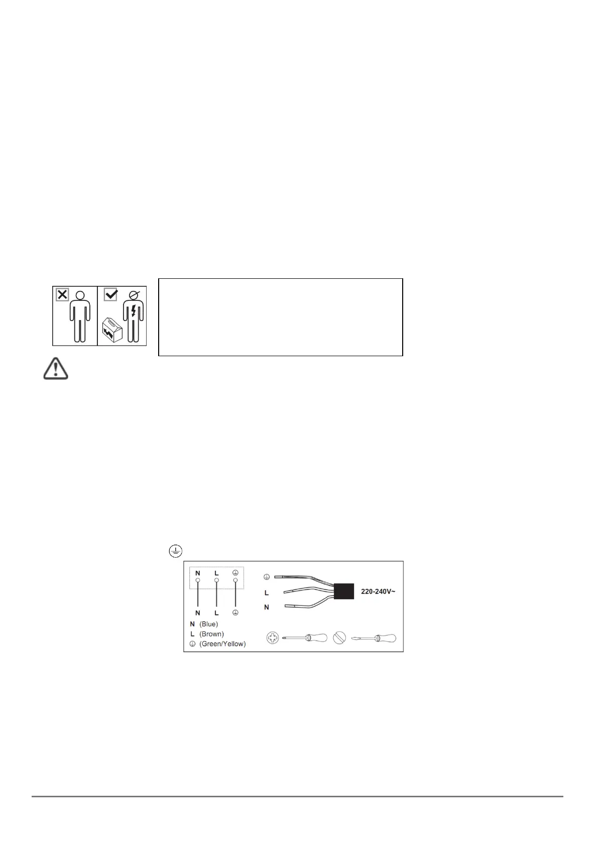 - L'installateur doit s'assurer que le raccordement électrique est correct et conforme aux règles de sécurité.