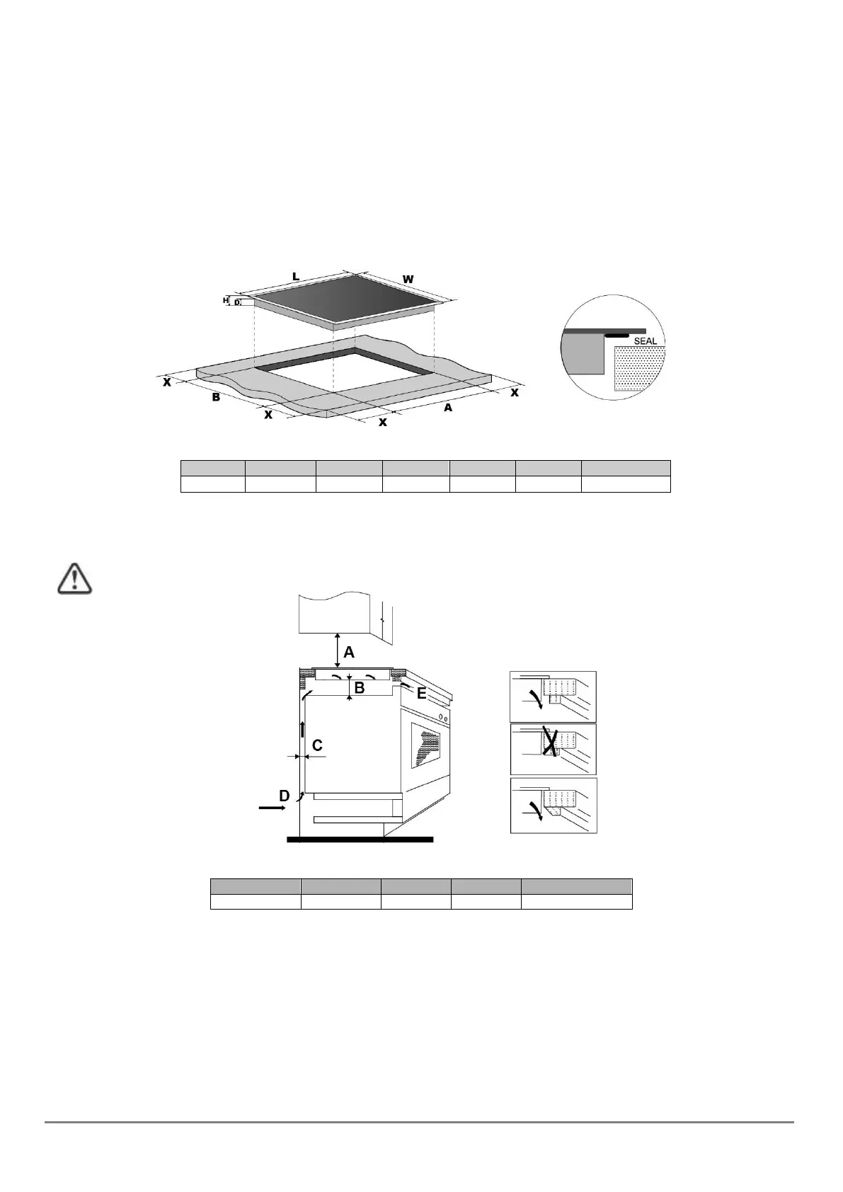 Note: The safety distance between the hob and the cabinet above the hob must be at least 650 mm.