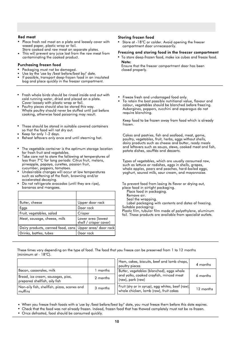Recommended storage times of frozen food in the freezer compartment