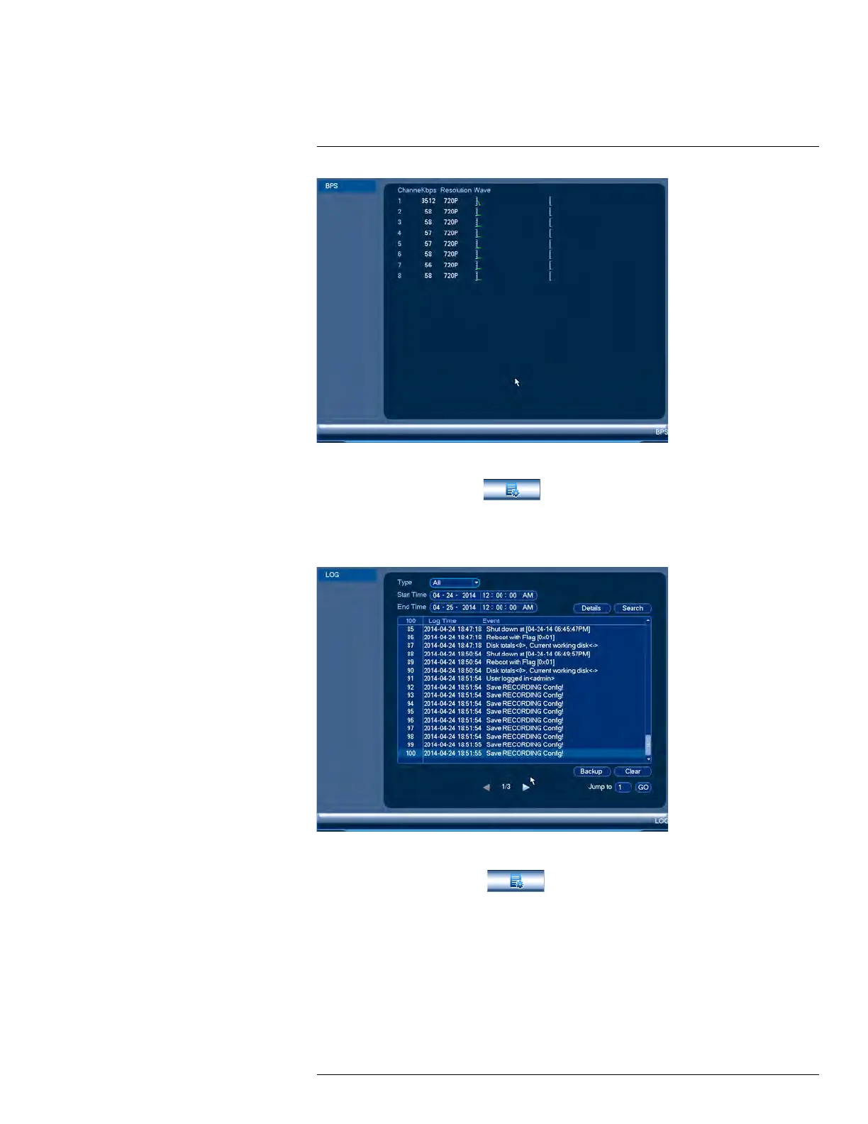 5. (Optional) Click Backup to export logs to a USB flash drive connected to the system.