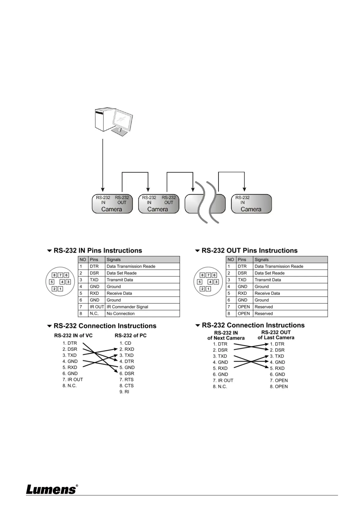 With RS-232 in/out, at most 7 Lumens cameras can be connected.