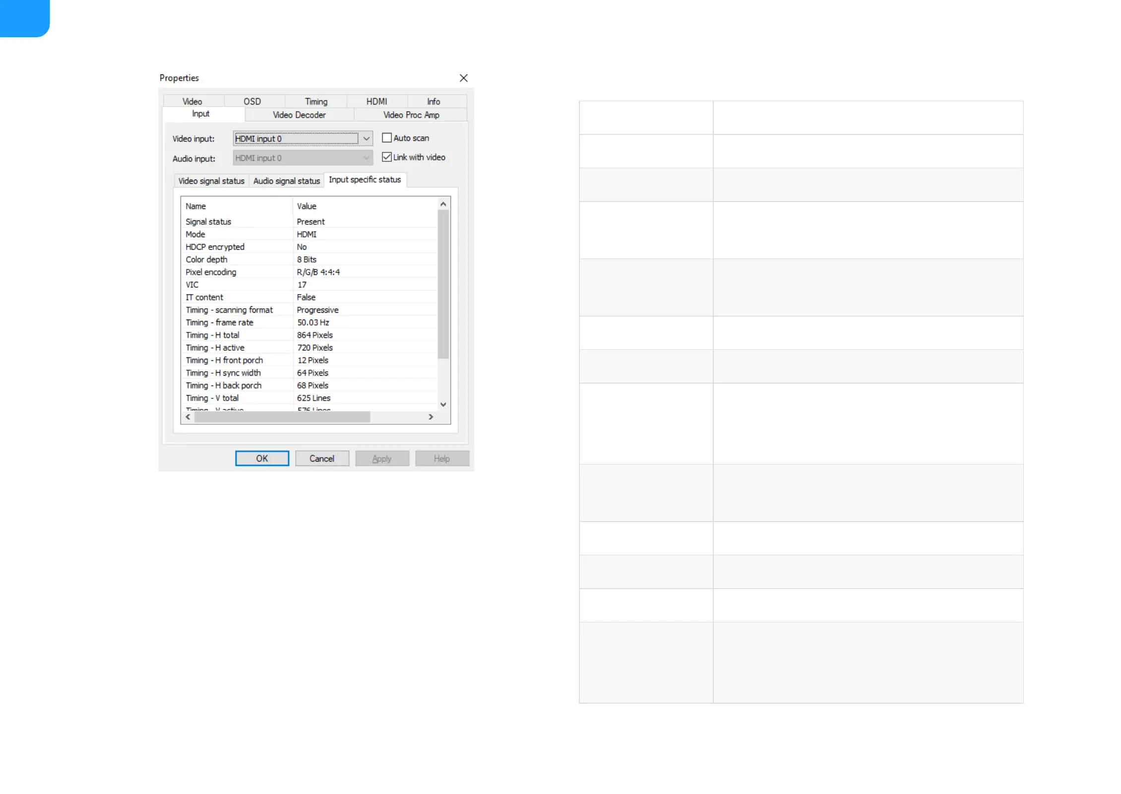 When HDMI signal is connected, the Input specific status tab is as follows: