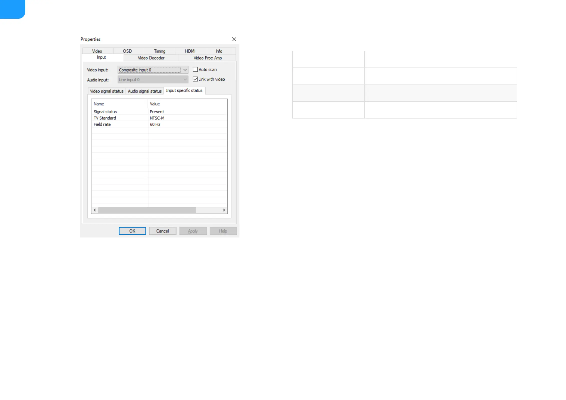 When CVBS signal is connected, the Input specific status tab is as follows: