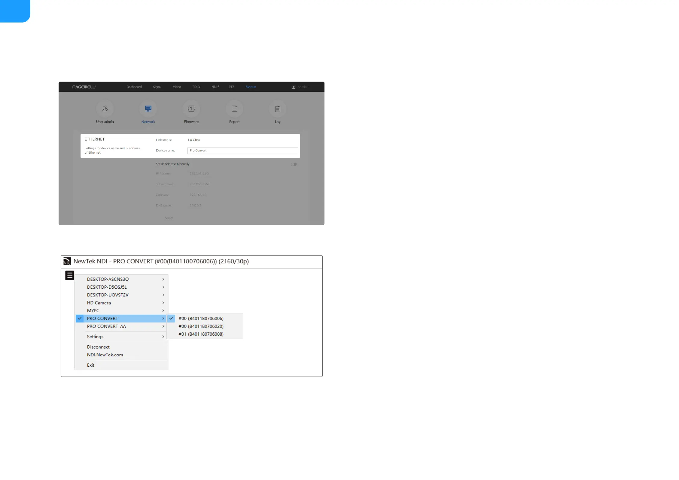 Device name, and Name in the NDI > General section, or verify