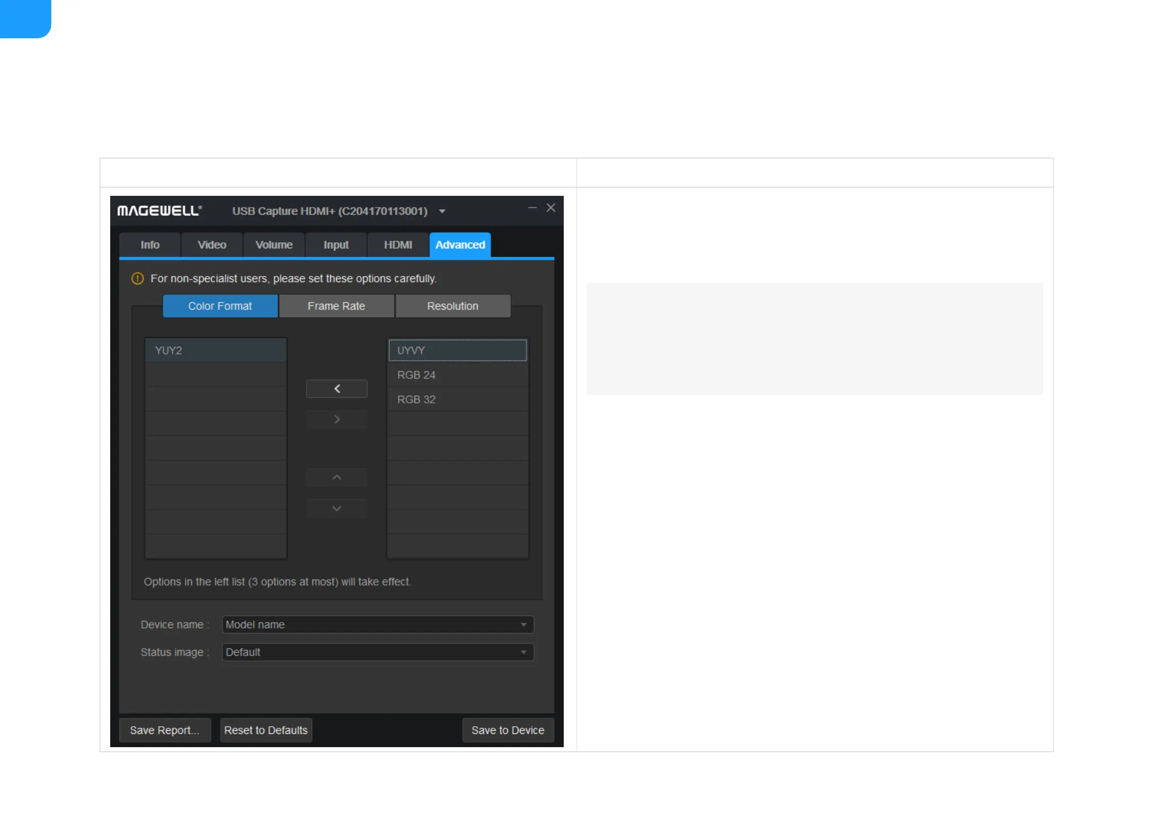 The range of values is YUY2(default), RGB 24, RGB 32, UYVY for the USB Capture HDMI+.■