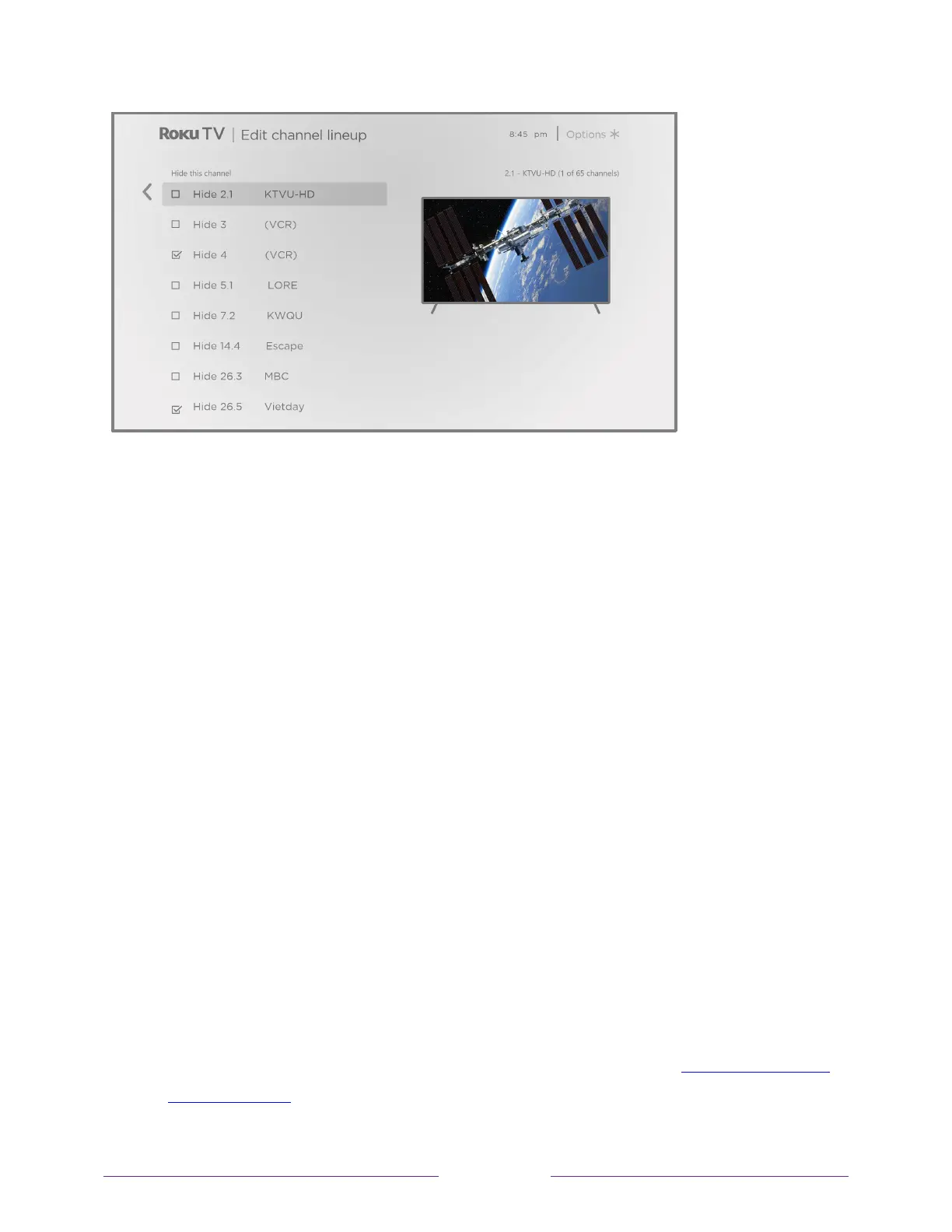 For each channel you want to hide, highlight it, and then press OK to select its check