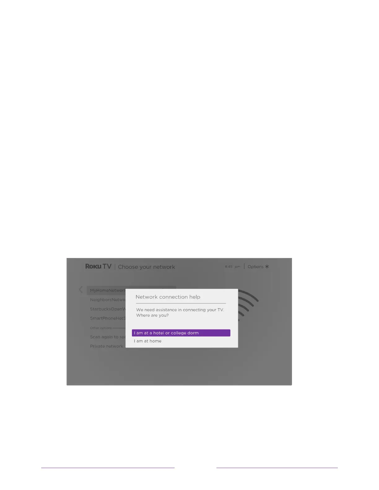 • Using your Roku TV on a hotel or dorm room network requires wireless