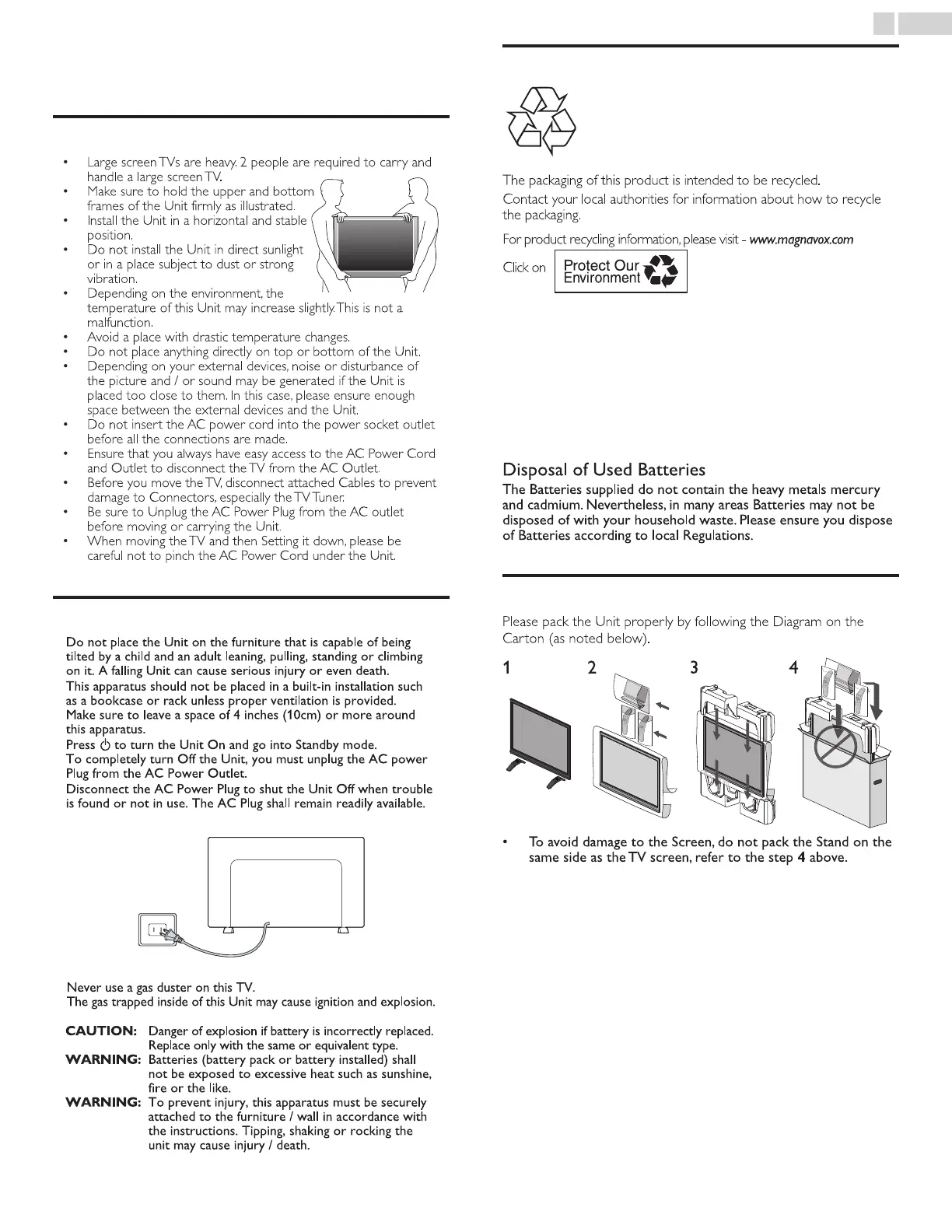 • Large screen TVs are heavy. 2 people are required to carry and