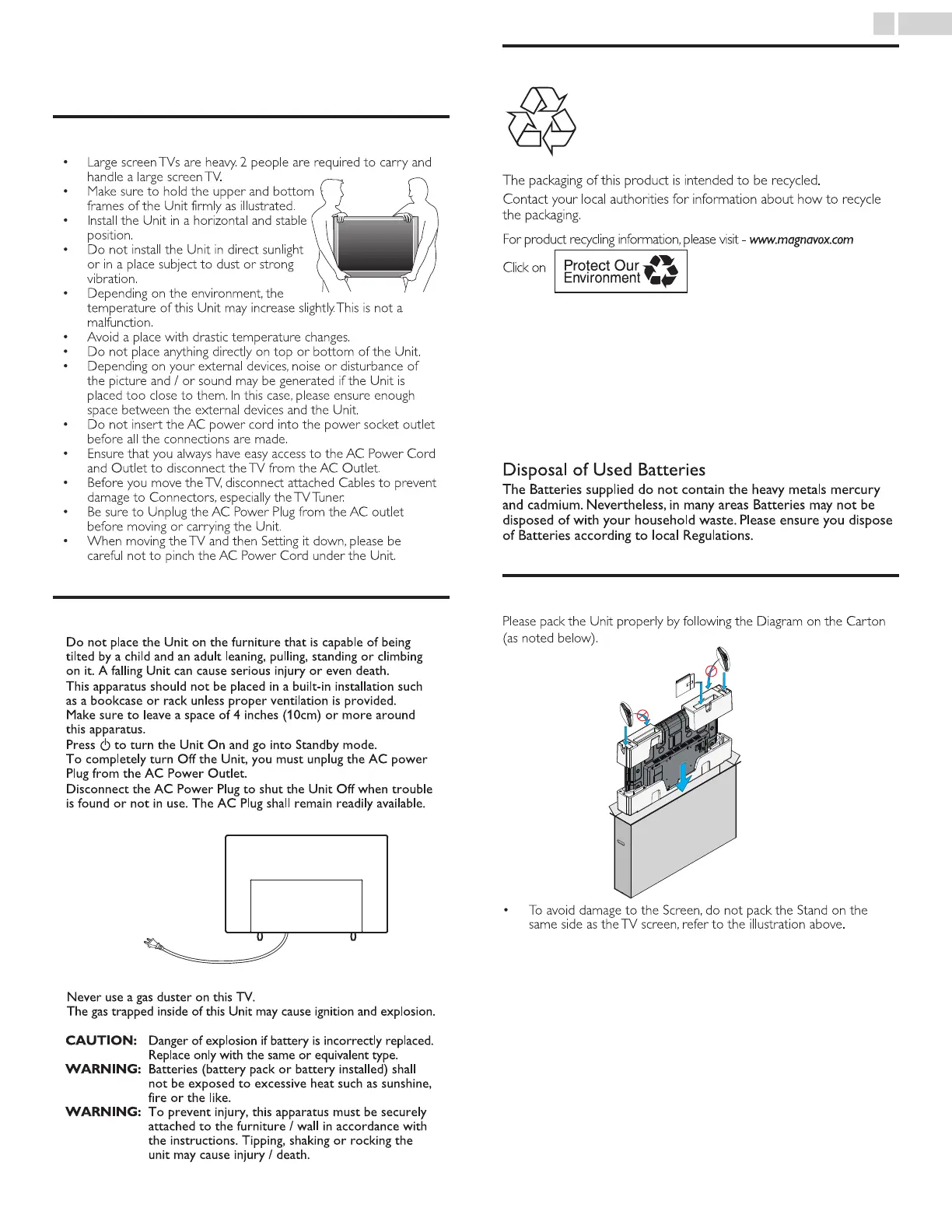 • Large screen TVs are heavy. 2 people are required to carry and