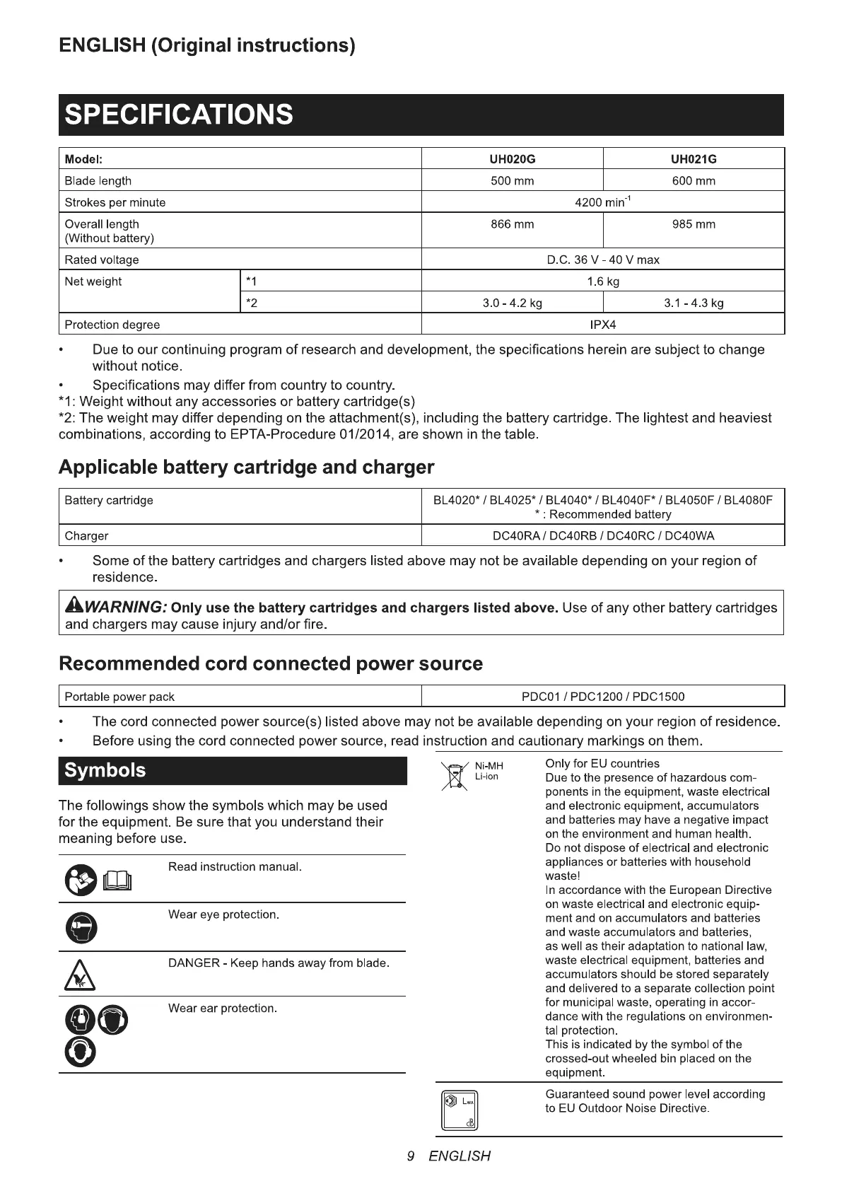Bekijk gratis de handleiding van Makita UH020G, stel vragen en lees de antwoorden op veelvoorkomende problemen, of gebruik onze assistent om sneller informatie in de handleiding te vinden of uitleg te krijgen over specifieke functies.