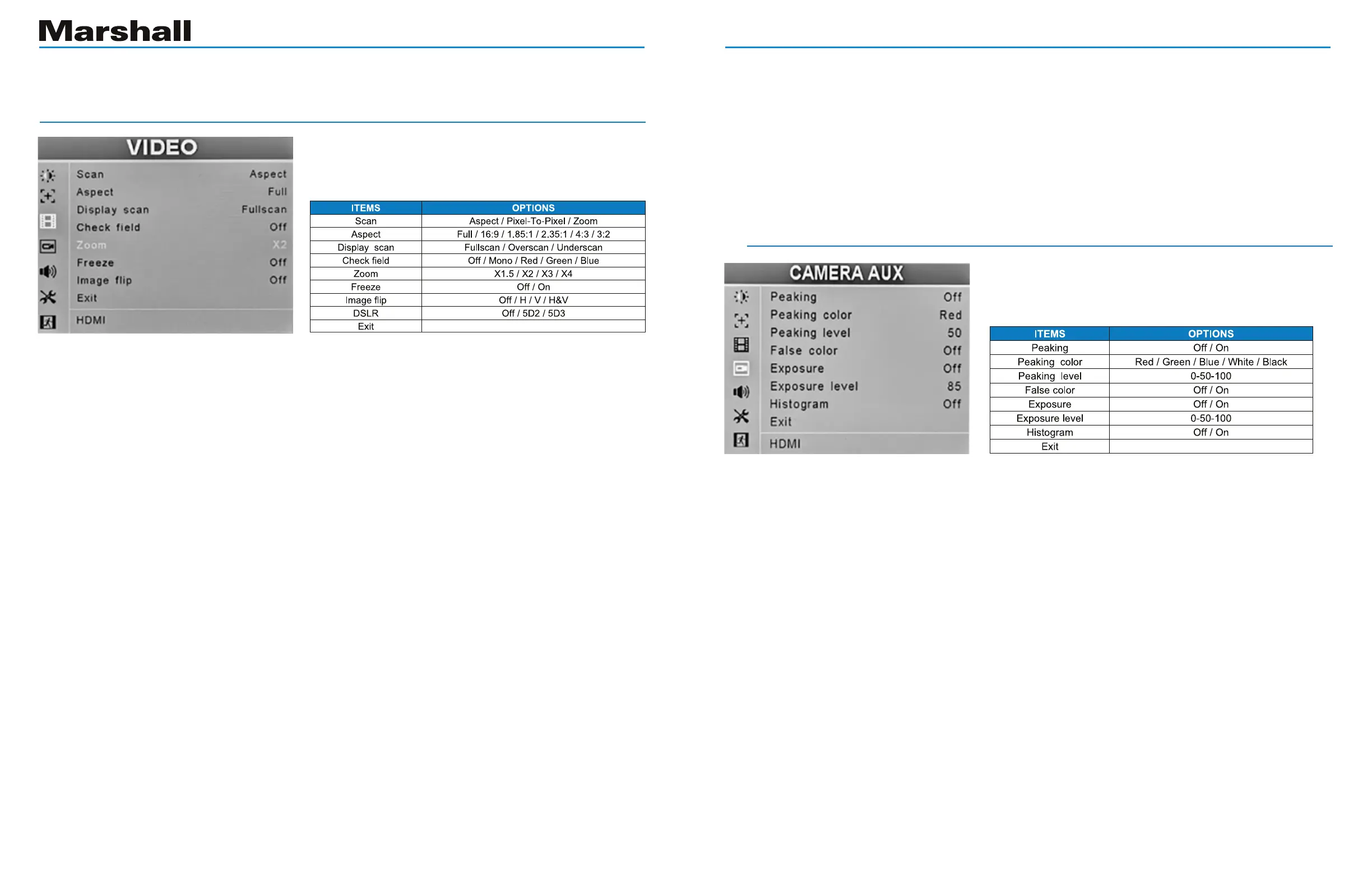 Peaking color – Peaking colors may be changed as needed for best visibility.