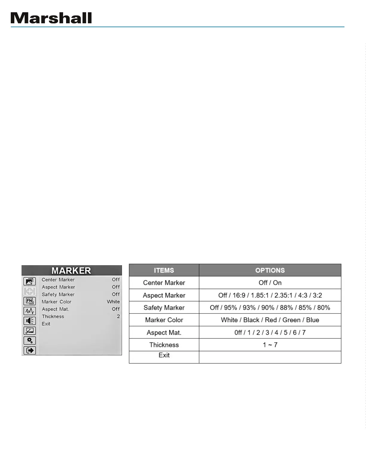 Center Marker – places a “+” mark in the exact center of the display. (Useful for checking camera